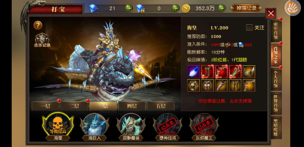 点击各个标签可以清楚的看到通关BOSS的要求、掉落介绍及刷新情况!