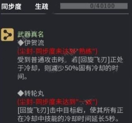 解锁武器真名需要同步度提升到指定的阶段,同步度达到熟练程度时,可以开始进行第一条真名(即伊贺流)的解锁试炼;同步度需要达到“一致”程度时,可以解锁第二条真名(即转轮丸)的解锁试炼。
