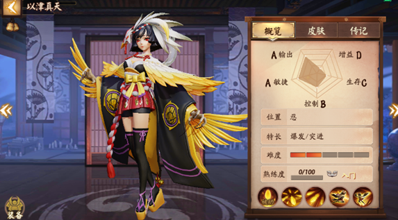 被动效果:以津真天释放技能或每隔8秒均会获得1枚黄金羽毛,最多同时存在3枚,普攻时将消耗所有羽毛,每消耗一根对目标额外造成15(+5.0*等级)(+12%额外攻击)点物理伤害。