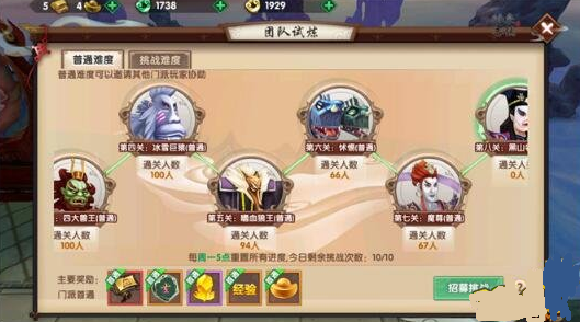 那么在现阶段,团队试炼已经拥有了9个关卡了,它们分别是紫面神君、威武骑士、四大兽王、冰雪巨猿、嗜血狼王、怵(chu)惕(ti)、魔尊、黑山老妖、火焰兄弟。这些BOSS除了实力强劲之外,还都拥有非常高额的奖励。
