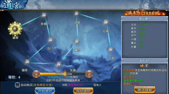 道宫升阶需要通过使用道宫进阶丹,玩家使用道宫进阶丹后会提升一定祝福值,祝福值满了后道宫就能够升阶了。这里需要注意的是道宫5阶之前祝福值是不会掉落的,5阶之后如果没有升阶,则次日会掉落20%的祝福值,所以建议大家在存够了进阶丹后再开始升阶,避免祝福值掉落。此外,如果玩家点了祝福值却没有升阶,那么可以通过使用元宝来保祝福值延迟时间;如果不慎掉主服值,也可以花费一定元宝来追回。