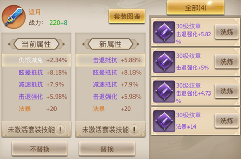 装备附加的属性可以通过纹章来洗练,选择适合的、属性较高的纹章进行洗练,可以提高装备战力。推荐选择带有套装属性的纹章。