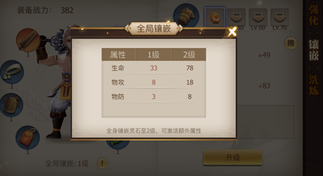 宝石镶嵌可以提升玩家各项属性,对战力也有不小的提升,升级宝石的等级可以提升战力值,全身装备宝石时会给予玩家角色全局镶嵌属性加成。