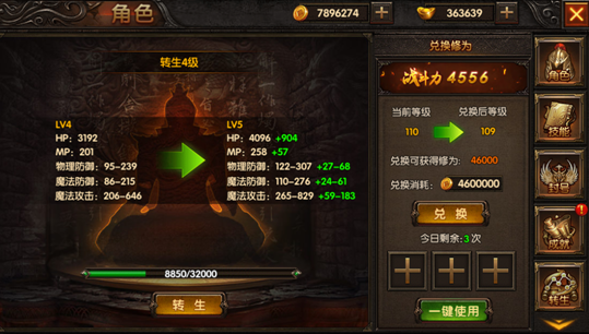 玩家等级达到80级,即可开启转生系统,转生可以获得强大的属性加成,同时提高转生等级可以穿戴更高等级的转生装备