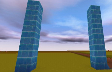 1、首先方块搭两根门柱,下图用的是6格,然后2根柱子间相距5格;