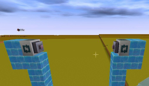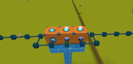 3、在转轴方块后面分别加上2个电能增幅器,转轴方块前面放2个延伸的方块,中间空一格;