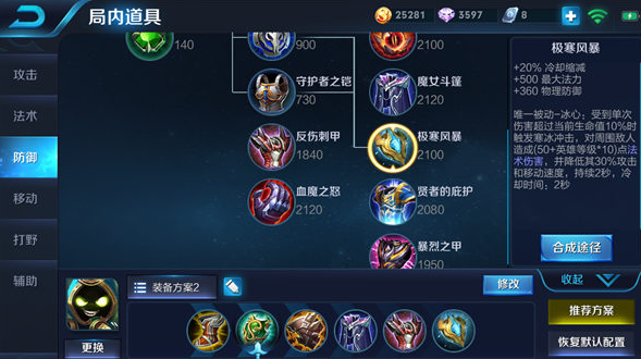 后期装备选择反伤刺甲和极寒风暴,保证了太乙真人不会遭到敌军物理刺客型英雄的秒杀,使得太乙真人不必过早的释放大招,且极寒风暴是太乙真人拖延敌军的重要手段。