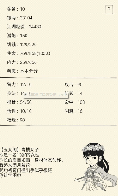 第二种:30身法10根骨,血量600多,内力300多,闪避60多 。这种玩法就比较好过了,除了刚开始二当家能命中,打到中途高闪避的作用就出来了。这种打发费内力药。