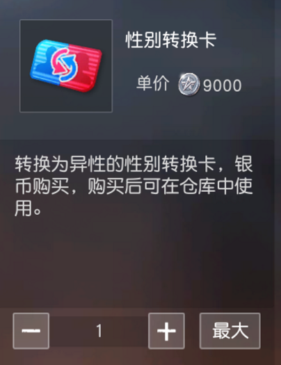 性别转换卡,可转换为异性角色。专属原性别的时装会自动脱下,并保管于外观内。