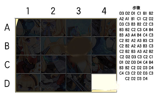 先拼第一行的前两个放到对应位置,第一行第三个放在1.4位置,1.4放在2.4位置,然后把1.3的移掉,1.3,1.4顺势归为,同理拼掉2.1,3.1,4.1,然后2.2,3.2,4.2,剩下五个随便拼一下可以了