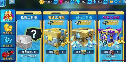 戏中共有三种类型的工具箱,分别是普通工具箱、钻石工具箱和特权工具箱,每种箱子都有几率可以直接开出完整的赛车,只不过概率不尽相同,如果你是人品爆棚的欧皇,那么就来痛快的开箱子吧!