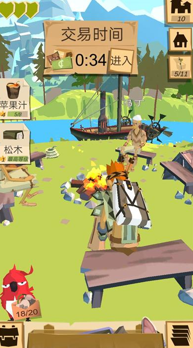 一路打兔子,砍树,然后到了营地,加工成木雕,玩具鸟来卖。