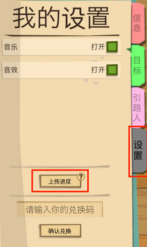 1、进入游戏,打开“我的设置”页面,如图所示,点击“上传进度”按钮即可成功存档。