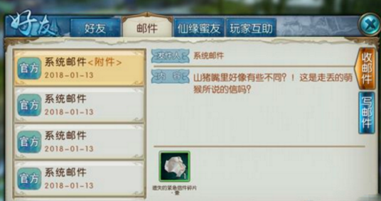 成功触发后会收到一个邮件,邮件里会有一个丢失的灵猴。再去狩猎山猪,有一定几率获得信件碎片一,如果失败了,丢失的灵猴也会消失。