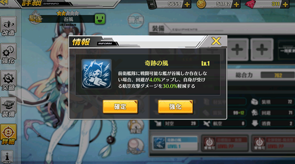 奇迹之风:当前锋舰队可战斗舰娘中仅有谷风的时候,回避上升4%(10%),所受到的航空攻击下降30%(50%)