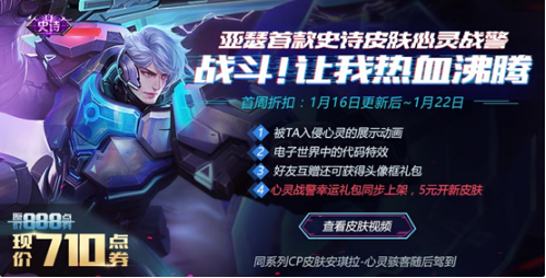 亚瑟首款史诗皮肤-心灵战警来袭,分享可得钻石*30,好友互赠新皮肤还可获得头像框礼包!使用亚瑟更有额外好礼!