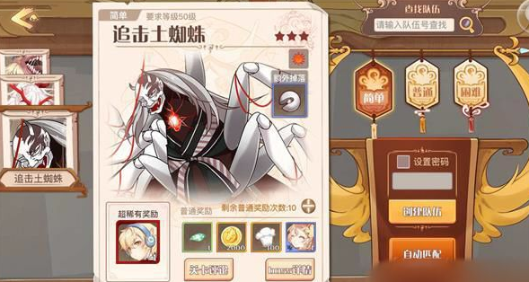 目前土蜘蛛副本的难度已经被削弱过,但仍是个极具挑战的副本。不过,达到50级这个要求的玩家打简单程度的副本还是没问题的,1坦3输出1奶妈,输出推荐带干扰技能的飨灵,奶妈推荐甜豆花,保险可以上2个奶。