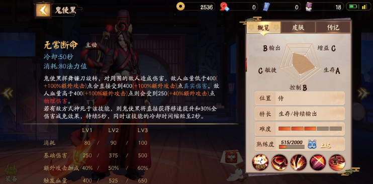 2.如果敌方式神中有判官,那么这局可能玩得就会很悲催,毕竟判官的天生被动十分恐怖,会给受到致命伤害的友军强行披上一个2.5秒的金身效果。因此鬼使黑的大招就会打不死敌方式神,而鬼使黑大招一旦打不中敌方式神,很容易就颓废了。。。