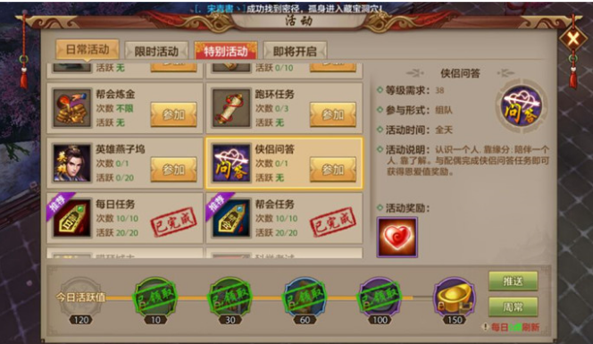 近期推出的一款活动,需要等级满足38级并且已经结婚的少侠来参与。必须是夫妻二人组队前往合仙子处参加问答。活动时间是全天开放,但少侠夫妻每天只有一次挑战机会。要好好把握哦。