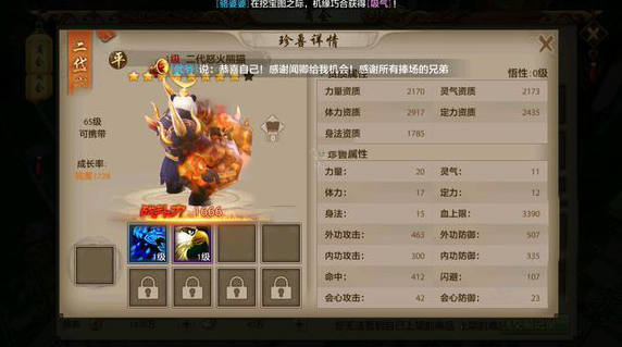 怒火熊猫的资质如上图所示,65级可以携带怒火熊猫。
