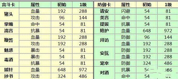 还给各位小主总结了宫斗卡以及防御卡的属性,宫斗卡和防御卡是和自己上阵的随从相辅相