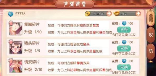 殿下在提升官品之后能解锁更多的宫斗技能,现有的宫斗卡也可以通过积累碎片得到提升。每种宫斗卡都能为随从提供不同的属性加成,除了上述获取碎片的途径,殿下还可以在宫斗界面的左下角进入声望商店,根据自己的官品消耗声望来购买宫斗碎片,然后在卡册界面对宫斗卡进行升级。