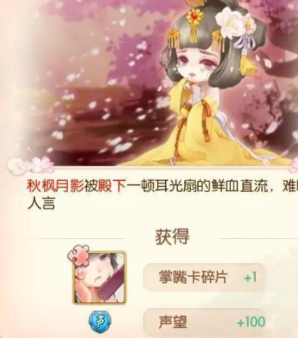 每次宫斗之后,殿下都能获得相应的碎片和声望,宫斗满八次也可以获得宫斗卡包,集齐一定量的碎片就能在卡册界面对宫斗卡进行升级
