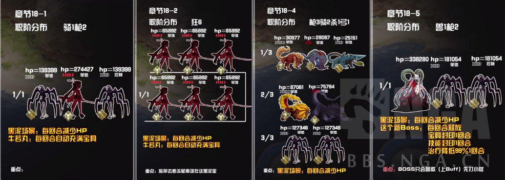 *注:牛肉丸每回合蓄力都为满格,可使用宝具。并且从本关开始,所有黑泥关卡内我方从者均会每回合减少HP,并随关卡进度加深而增大减血幅度。