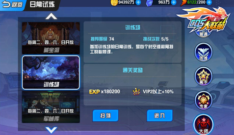 玩法介绍:训练场是日常试炼玩法中玩家主要的经验收入来源,在该玩法中,玩家要在被毒气覆盖的森林中迎战数波袭击的敌人。场景中会有一个紫色的结界保护玩家,但当玩家暴露在结界外面则会持续掉血,挑战成功可获得大量的经验。