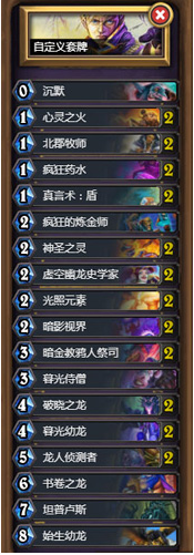 现在来坦普卢斯说说这张卡,这个卡位我先前带的是一张莱拉,如果没有这张卡的同学也可以换一张莱拉,后面为什么我换了这张卡呢,是因为有一次打一个宇宙牧的时候对面发现我是心火牧之后一个场面不给我留,我的发现牌也没什么好的龙,然后灵机一动拿了这张牌,结果可想而知了,拍下去对面两回合打不死我,然后被我的两回合翻倍心火斩杀了,效果奇好。这张牌主要针对后期控制卡组,解场能力很强职业,因为对面一旦知道你是心火牧之后基本不会给你留什么场面,针对天梯大户宇宙牧非常有奇效。