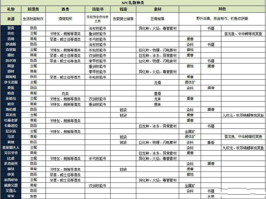 最常见的礼物当然是各种精致的料理,部分战斗NPC也会喜欢武器技能相关的书籍,也有喜欢各种矿物、鱼类、甚至是稀有素材的NPC!