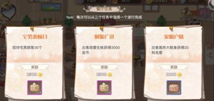 某著名成功人士分享过成功秘诀:先给自己定一个小目标。经营系统中的餐厅任务,就是这个给你指路的小目标。每三小时刷新一次,系统会提供三个不同任务,你可根据自身经营状况选择任务,有倾向性的配菜,能够得到更多收益。