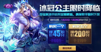 冰冠公主上架的时候,同步会开放点券夺宝限时折扣(1月22日-1月29日), 6元不到就有机会把新皮肤抱回家,赶紧来试试吧~