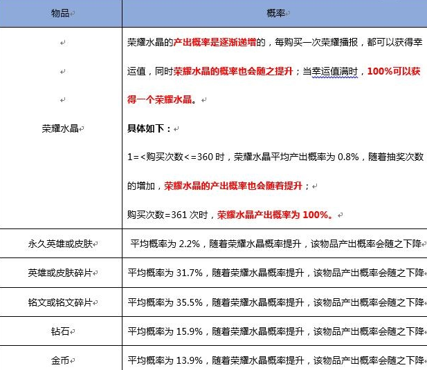 根据官方的公示,平均概率只有0.8%,当抽取到361次必定会得到荣耀水晶,但是每次抽取需要6块钱,361次也就是需要2166元。
