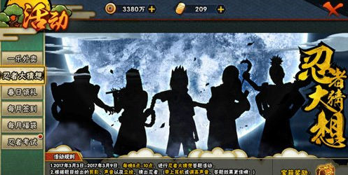 活动内容:玩家根据忍者的剪影、声音以及立绘等信息,猜出对应的人物。答对题目即可获得奖励,限定时间内完成所有答题并全部正确,还可获得额外奖励。全部答对才有资格进入排行榜,答题完成时间越早排名越靠前。快来猜猜他(她)是谁?