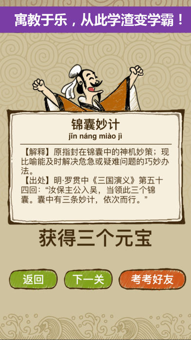 成语玩命猜苹果版是当前国内十分热门的一款小游戏,大家看图猜成语,无论何种年龄段,都可以进行相关的学习与了解,也可以与你的孩子、朋友、同学一起进行答题通关比赛,寓教于乐的模式,加之精美生动的画面,让人受不释手。