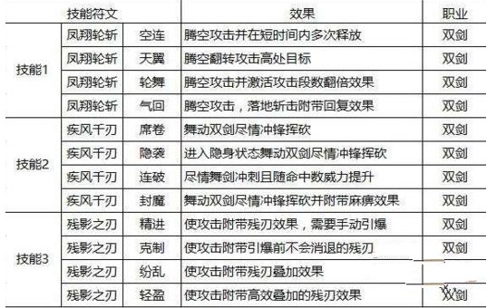 上图则是双剑所有技能符文的效果,玩家可以根据自己想要的技能效果进行搭配选择;
