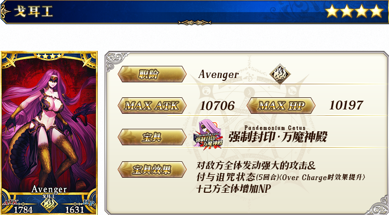 【游戏效果】对敌全体强力攻击&赋予诅咒状态(5回合)<Over Charge效果提升>&我方全体NP增加10%[1]