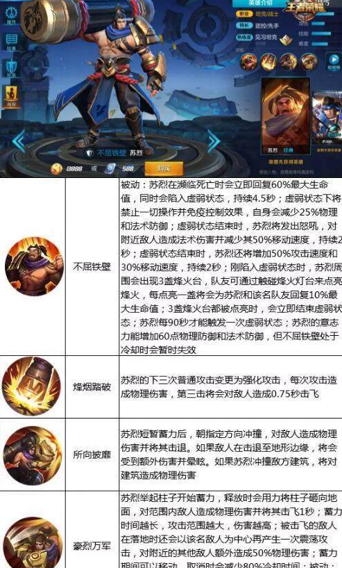 苏烈作为坦克中的佼佼者,由于被动的存在坦度十足,很难被对面击杀。中前期可以大胆去卖,给打野gank创造好机会,而发育成形的大叔,在团战中更能打出不俗的控制与伤害!喜欢暴力的召唤师不要错过了哟~