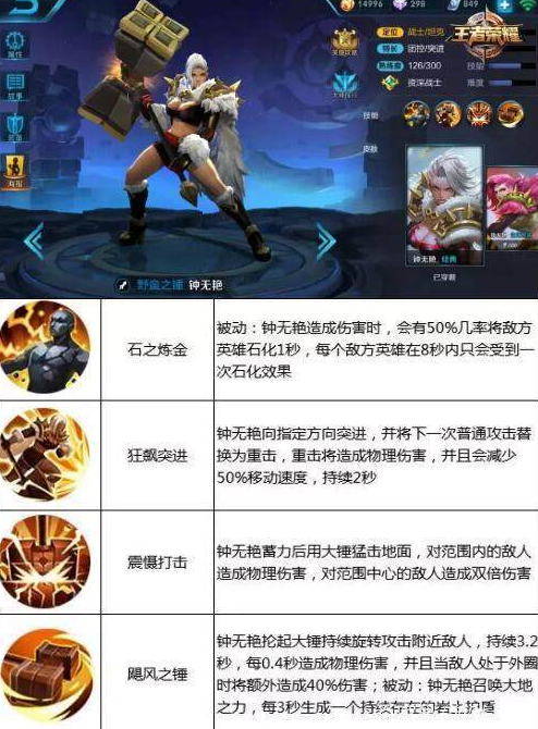 石━━∑( ̄□ ̄*|||━━化~石化女战士钟无艳在经过调整后,伤害和侵略性蹭蹭地上升,利用1、2技能不停地骚扰对方的节奏,团战大招打出成吨的控制与伤害,追击逃跑这些就更不在话下哦~召唤师们可以尝试下~