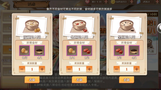 活动期间,通过普通关卡、困难关卡,外卖来获得腊八粥道具,获得的代价可以进行煮粥获得各种腊八粥,可以腊八粥碎片,使用碎片合成飨灵腊八粥