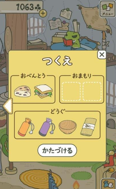 小伙伴们在进入室内之后,可以在左下角看到一个按钮,这个按钮上面的日文是【准备】的意思,打开的话就可以看到桌子哦,所以也就相当于左下角的按钮是桌子,点击进入,可以看到一共有八个框框,左上方的两个框框是放食物的,右边的两个框框是放车票呀护身符之类的东西的,然后下面的四个是放各种道具的,比如说碗,或者是帐篷、头巾等等,小伙伴们放了东西进黄色框内退出就行了,下面的按钮是清空的意思,不用点击。