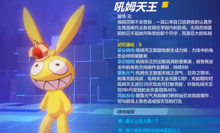 记忆战场新Boss,值得一提的是没有属性约束,也没有标明物抗和元素抗性,所以应该可以用各种主C挑战,技能也和之前的大吼姆差不多,战争践踏和香蕉皮都有,同时还有聚气,这个效果如果不被打断敌人就有12秒无敌,如果被打断就会有造成大量伤害。