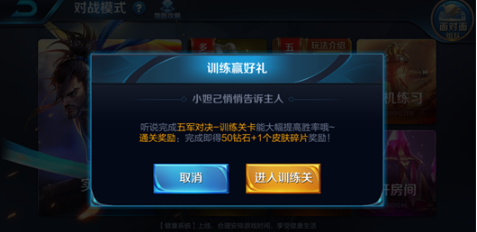 点击五军对决入口会弹出提示询问玩家是否需要先进行五军训练关,五军对决是完全不同于王者峡谷的一种全新玩法,我们强烈建议玩家在正式对抗前先完成一次训练关的内容。