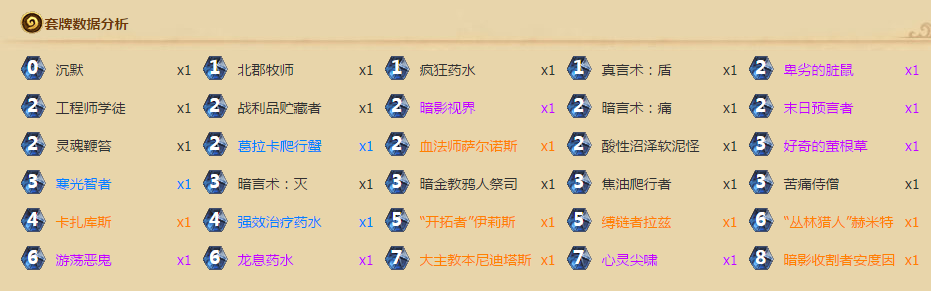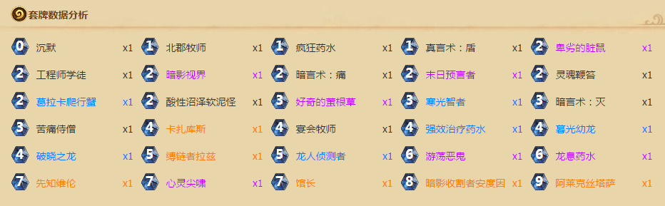 这是一套很有趣的卡组,终于让安度因想起来自己还是能坑蒙拐骗的。除了几张关键牌外,其余卡牌费用基本在3费或3费以下,快攻抗性很不错。