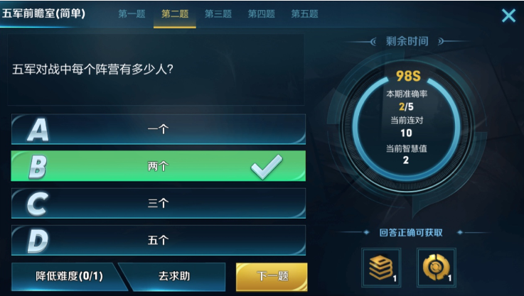 以上就是西西小编为大家带来的五军对战中每个阵营有多少人,王者荣耀王者知道答题答案。希望大家喜欢。