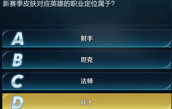 首页 → 安卓游戏资讯 → 安卓游戏攻略 → 新赛季皮肤对应英雄的职业定位属于 王者荣耀王者知道答题答案