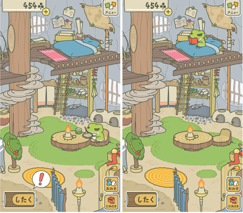 游戏的主角是一只大眼睛无口的小青蛙,小青蛙独自居住在一个石头洞的小屋里,屋外头种着一片幸运草,屋里则是木头做的小阁楼。小青蛙平时就会在这里吃饭,在阁楼上的被窝看书,过着十分“居士”的生活。当然,它最大的爱好,就是出去旅行,世界这么大,小青蛙也想出去看看。放下一切琐事,小青蛙背起简单的行囊,带上它的荷叶小帽子出发了。