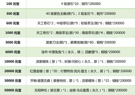 江湖有梦,迴梦园今日开园,迴梦园主感谢各位贵客的大驾光临,为累计充值达到指定数量元宝的少侠,提供了多种返利礼包: