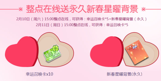 玩家2月10日整点在线就可以获得永久的新春星耀背景的,此外还有5个幸运召唤卡可以获得。另外玩家在11日周日的时候整点在线的话可以获得5个幸运召唤卡。